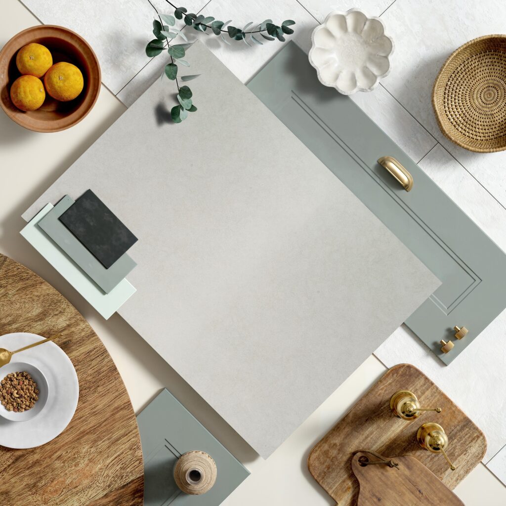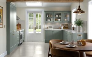 Chosen by almost one third of customers last year, ‘Sophisticated Sage’ is a proven favourite for the heart of the home. Featuring the Rowen door style, a modern design with subtle detailing, its Supermatt Sage Green finish brings natural warmth while balancing contemporary elegance with timeless charm. Paired with the Magnolia worktop, a soft cream stone with medium-grain texture and delicate caramel and grey accents, this combination creates a calm, inviting kitchen. Finishing touches of brushed satin brass knobs add a refined metallic highlight. For those seeking a slightly darker or lighter option, ask your design consultant about Matt Pistachio Green or Supermatt Smoke Green.